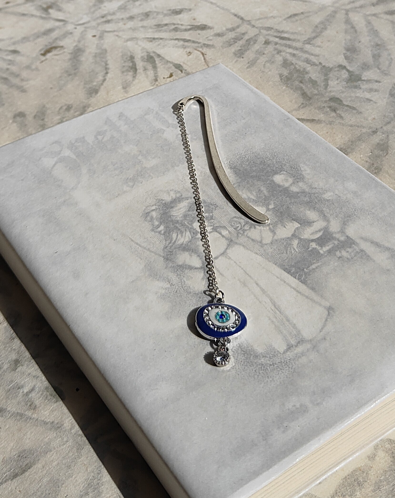 Segnalibro con charms in smalto e strass e ciondolo in strass.