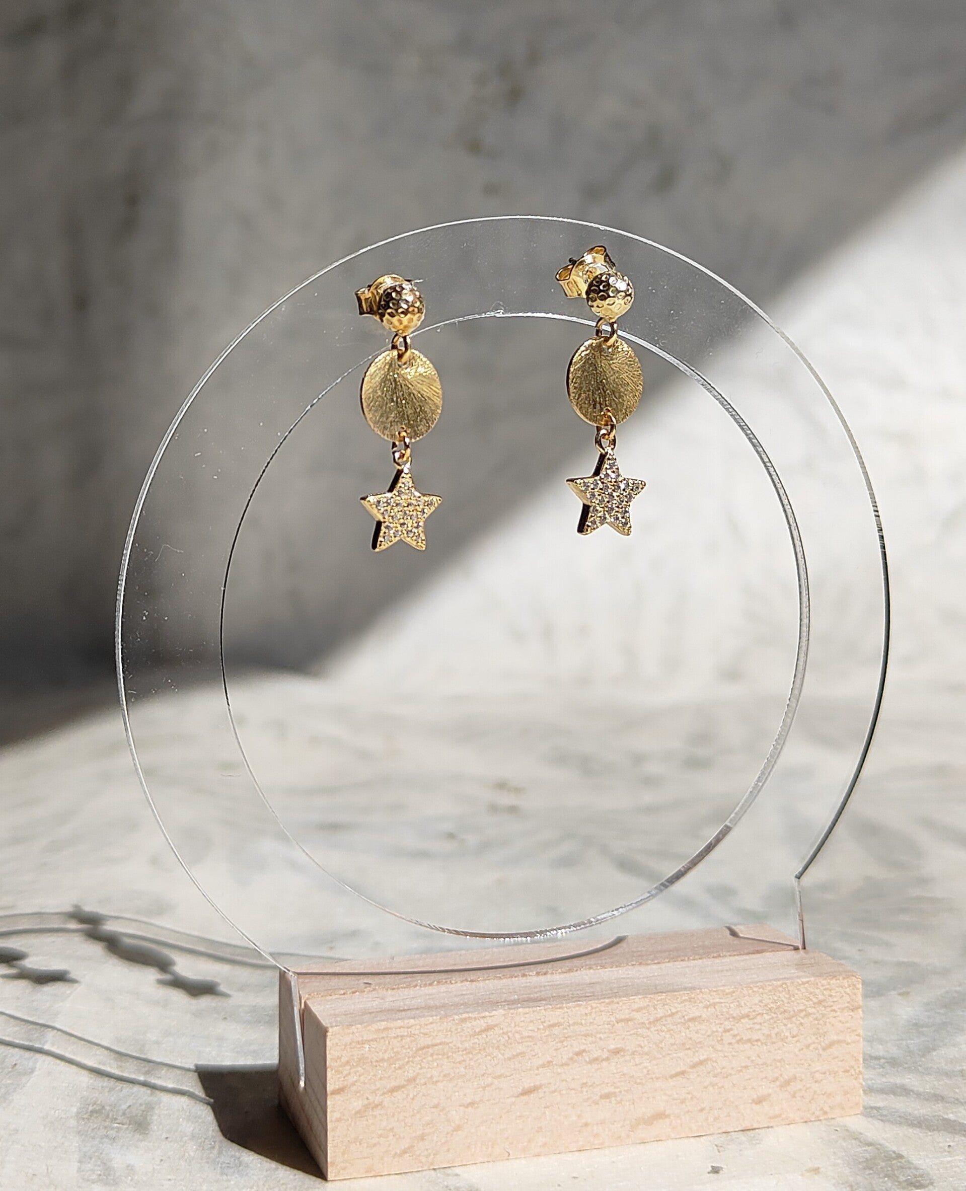 Orecchini lobo effetto martellato, piastre effetto graffiato e charms con zirconi.